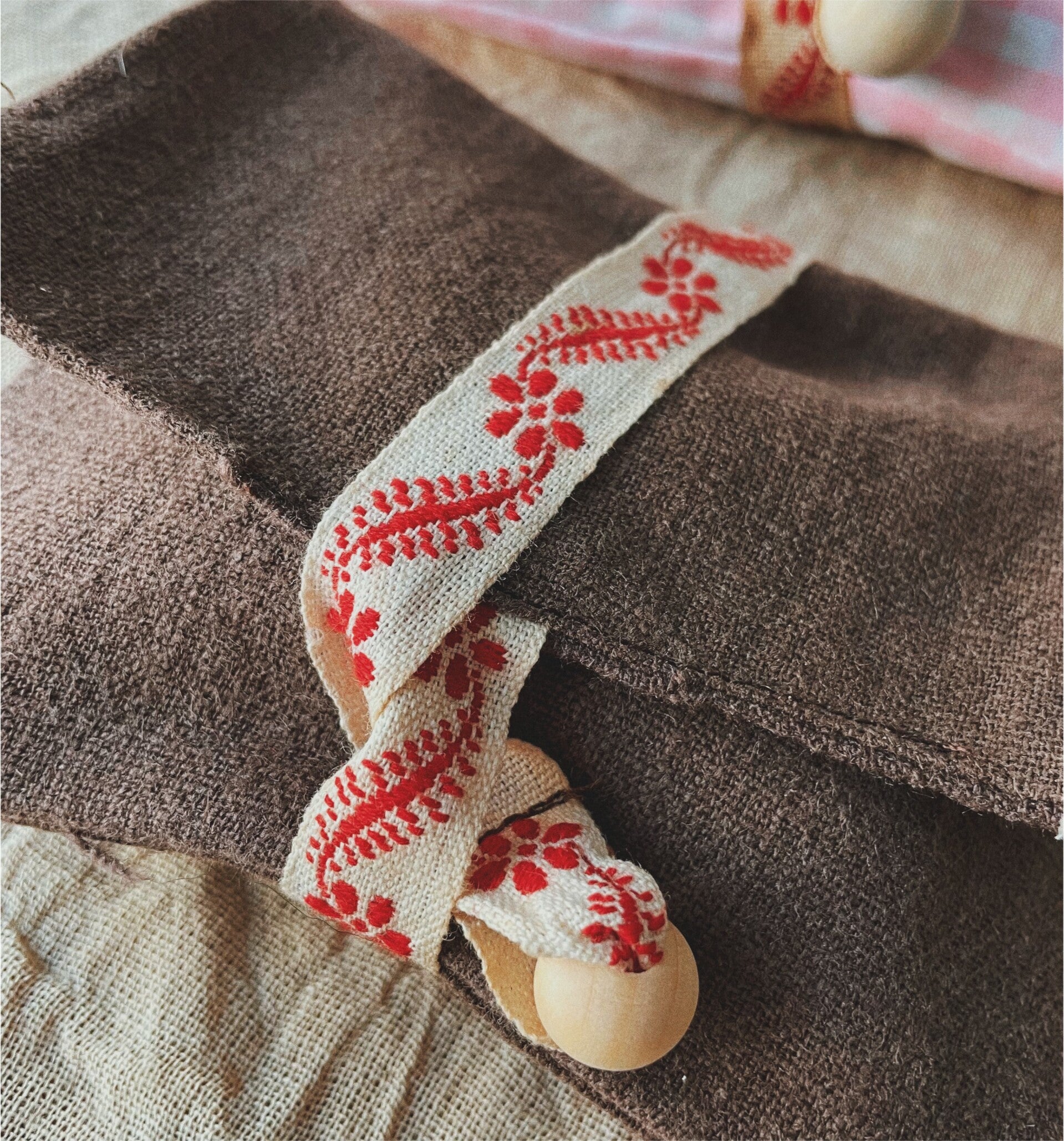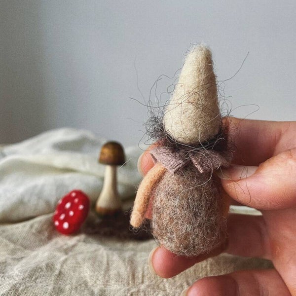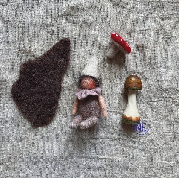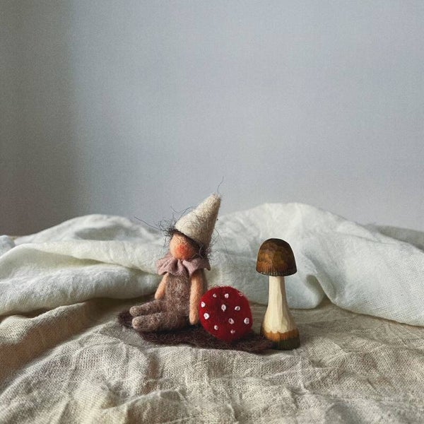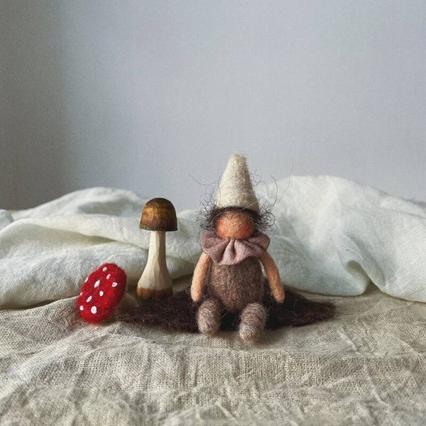 Loulou is mini- vanaf bil tot mutspunt 7cm. Ze zit op een bruin wollen lapje, met een houten handgesnede paddestoel en een wollen mini vliegenzwam met geborduurde stippen. Loulou is op haar kraag na helemaal van wol.