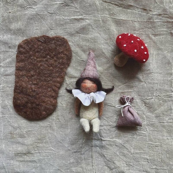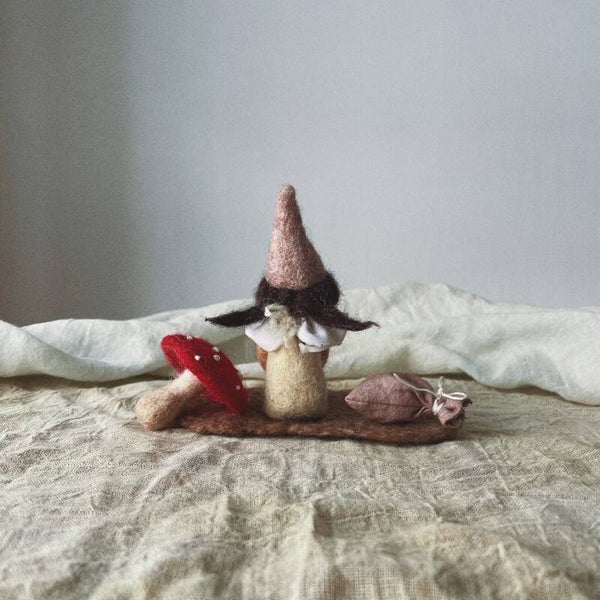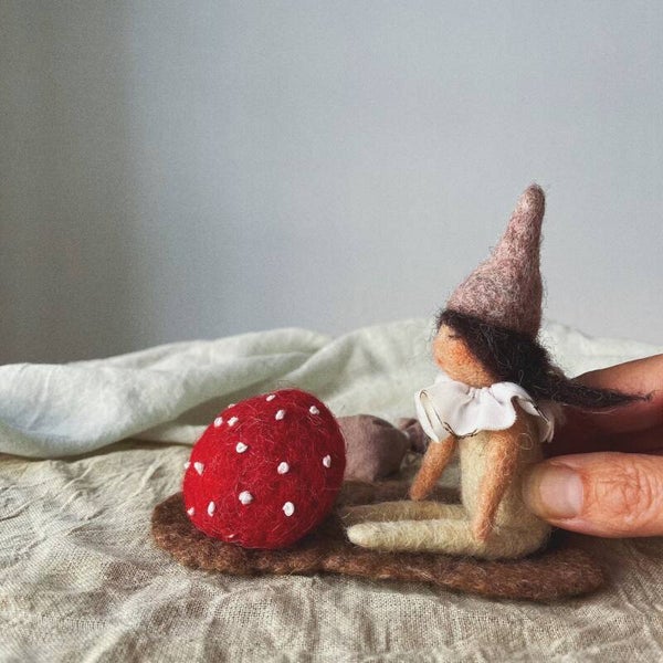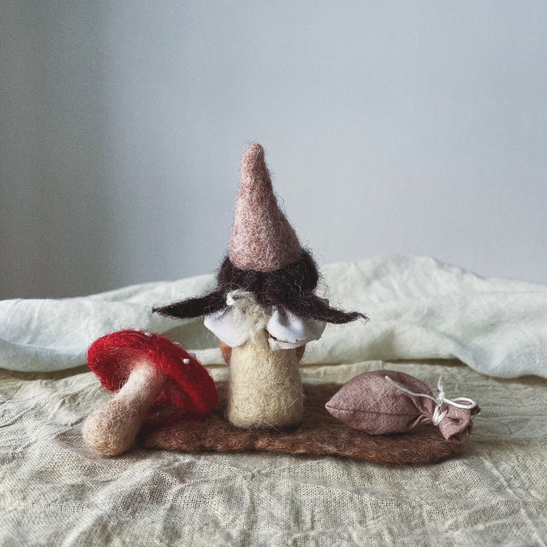 Momo is op haar kraag na helemaal van wol. Ze is 10,50cm van bil tot mutspunt. De vliegenzwam is helemaal genatvilt, de stippen geborduurd. Momo zit op een wollen kleedje (genatvilt) en ze heeft een zakje lavendel van handgeverfde stof.