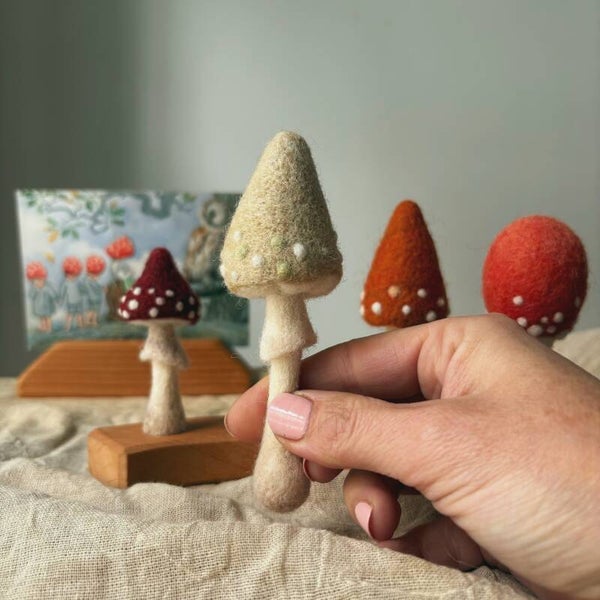 Deze paddestoel is zo'n 11cm hoog. Mooi als steker in een jaarring, maar kan ook mooi los liggen of opgehangen worden als ornament. (Zelf even draadje doorheen halen). De stippen zijn in twee kleuren. Bijzondere tint, ook mooi in winterse of lente jaartafels.