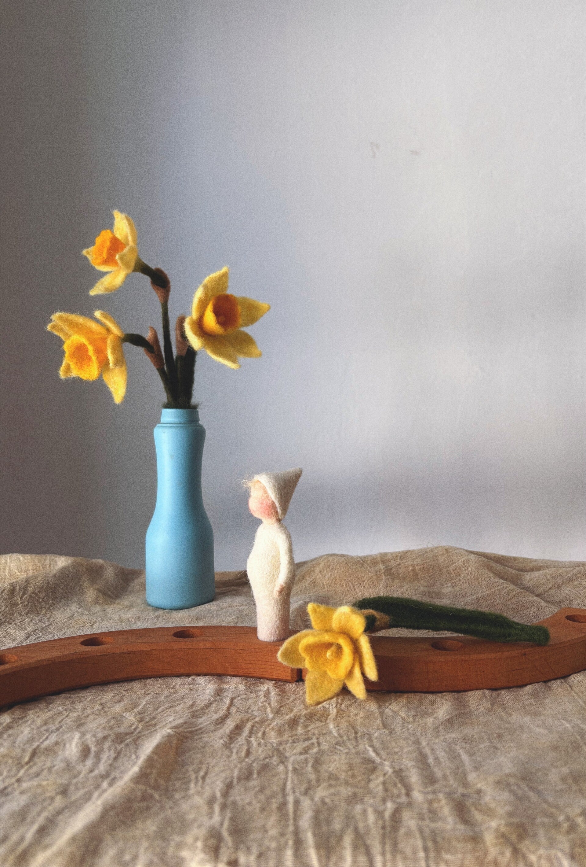Dit witte zuivere popje neemt alle kleuren en seizoenen aan... nu met een lentebloem de narcis. Niet vastgenaaid in het handje dus maar smaak te rangschikken (zie foto's). Zo'n 10cm. De narcis is tot de knik in de stengel ook 10cm.