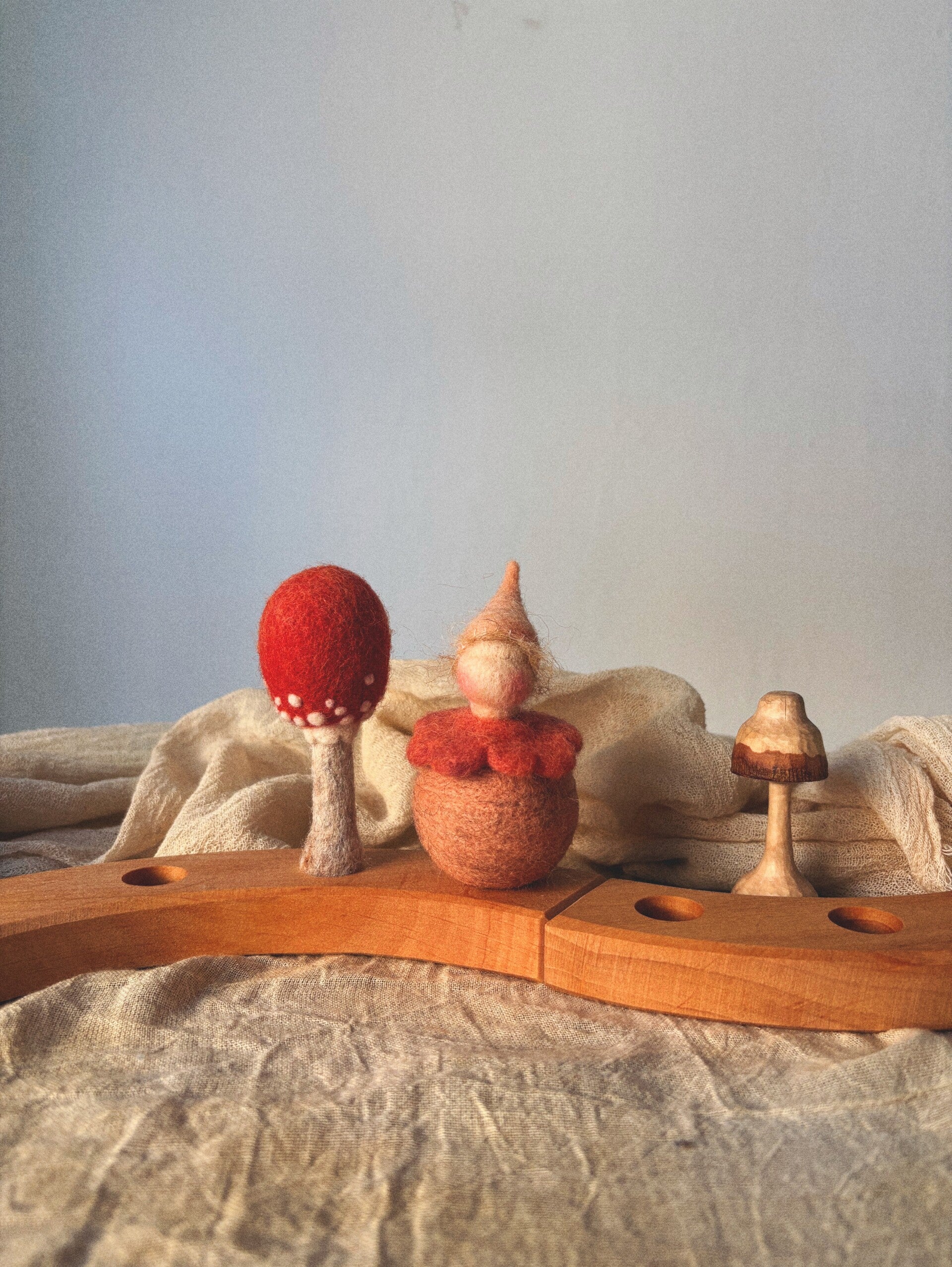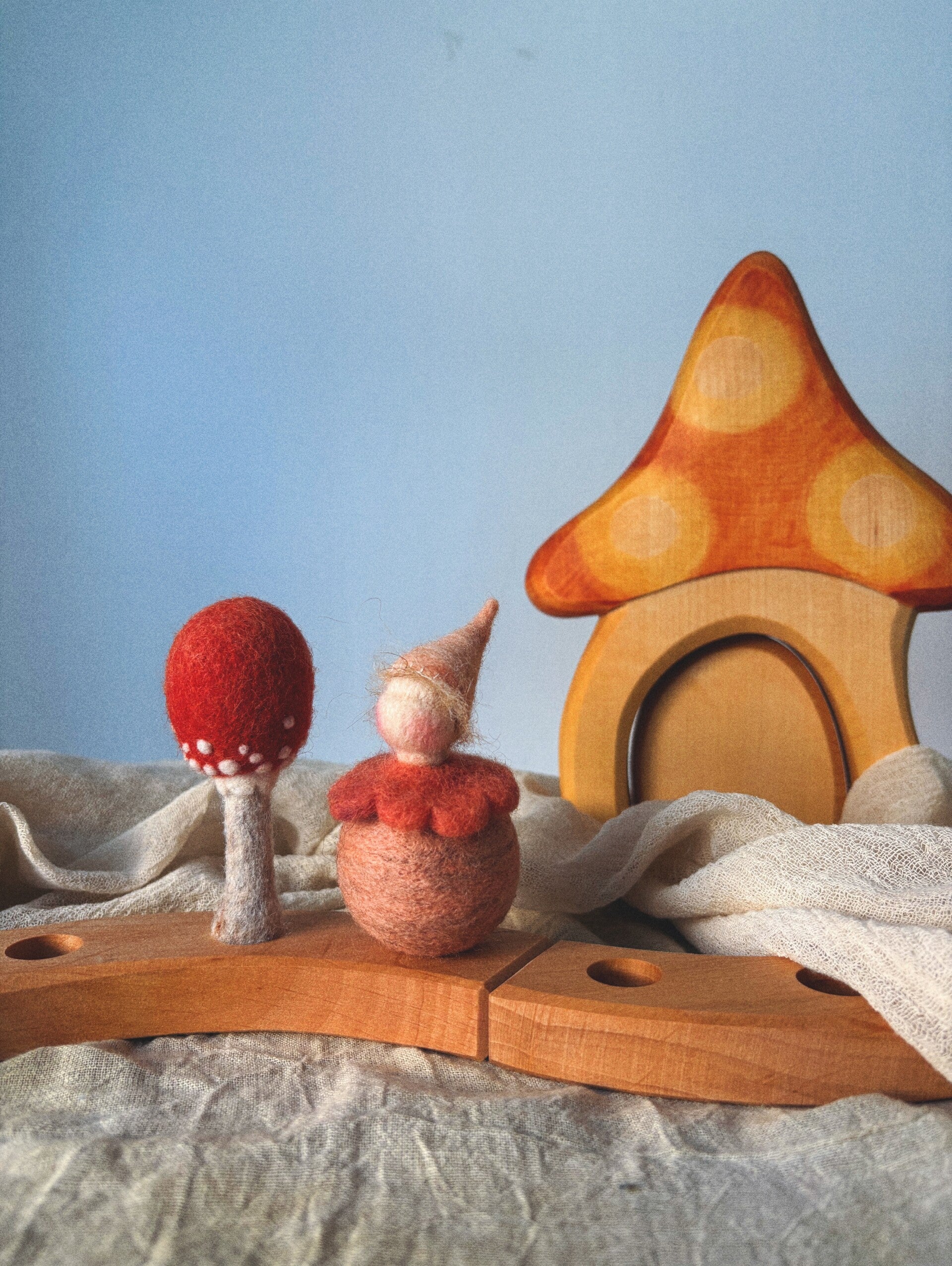 Dit popje heeft een mutsje en lijfje van plantaardig handgeverfde wol. Het mutsje heeft een festonsteek langs de rand. Het lijfje is helemaal bal vormig. Op de feestring van Grimms kan ze heel mooi staan of anders op een geplooide lap. 100%wol. Samen met de boleet/paddestoel vormen ze een warm herfstige set. De boleet is zo gemaakt dat je het als steker in de jaarring van Grimms kunt steken. Maar ook gewoon mooi om neer te leggen. Zie foto's.