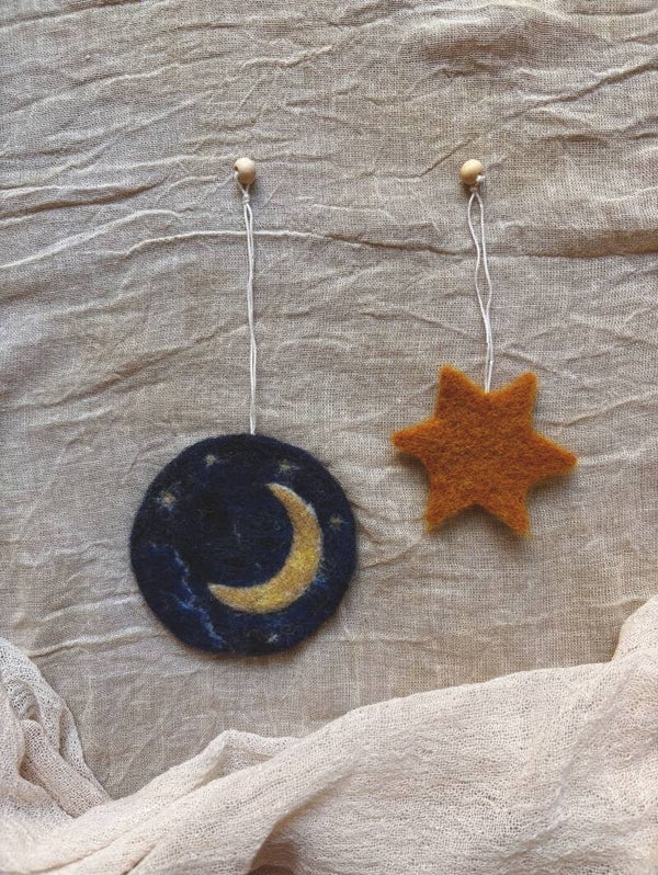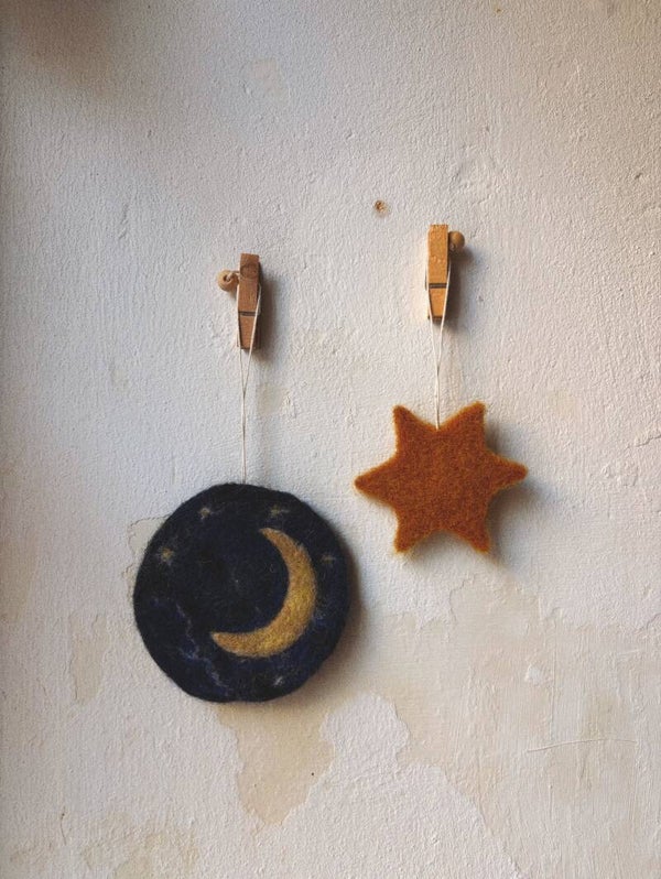 Een tijdloos setje van een maan en een sterretje. Ze zijn heel mooi in de seizoenen tafel voor aan de haakjes. Heel fijn rond de donkere dagen van het jaar. Vooral met de jaarfeesten van Sint Maarten en Sinterklaas als lichtjes in het donker. Om ons te herinneren aan het Licht dat ons verlicht. Met kerstmis kunnen ze ook in de boom.