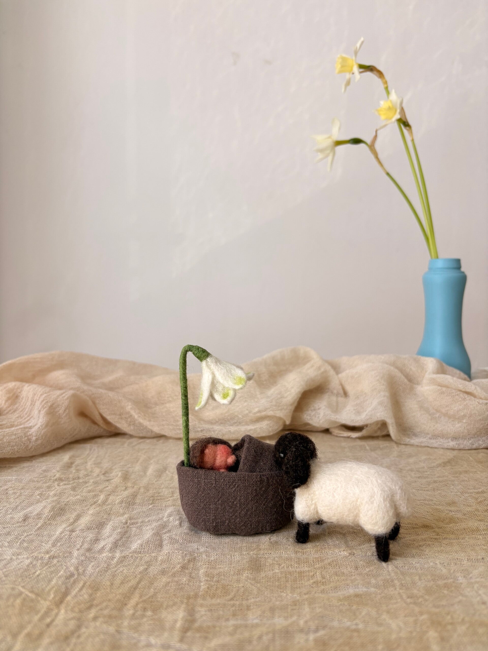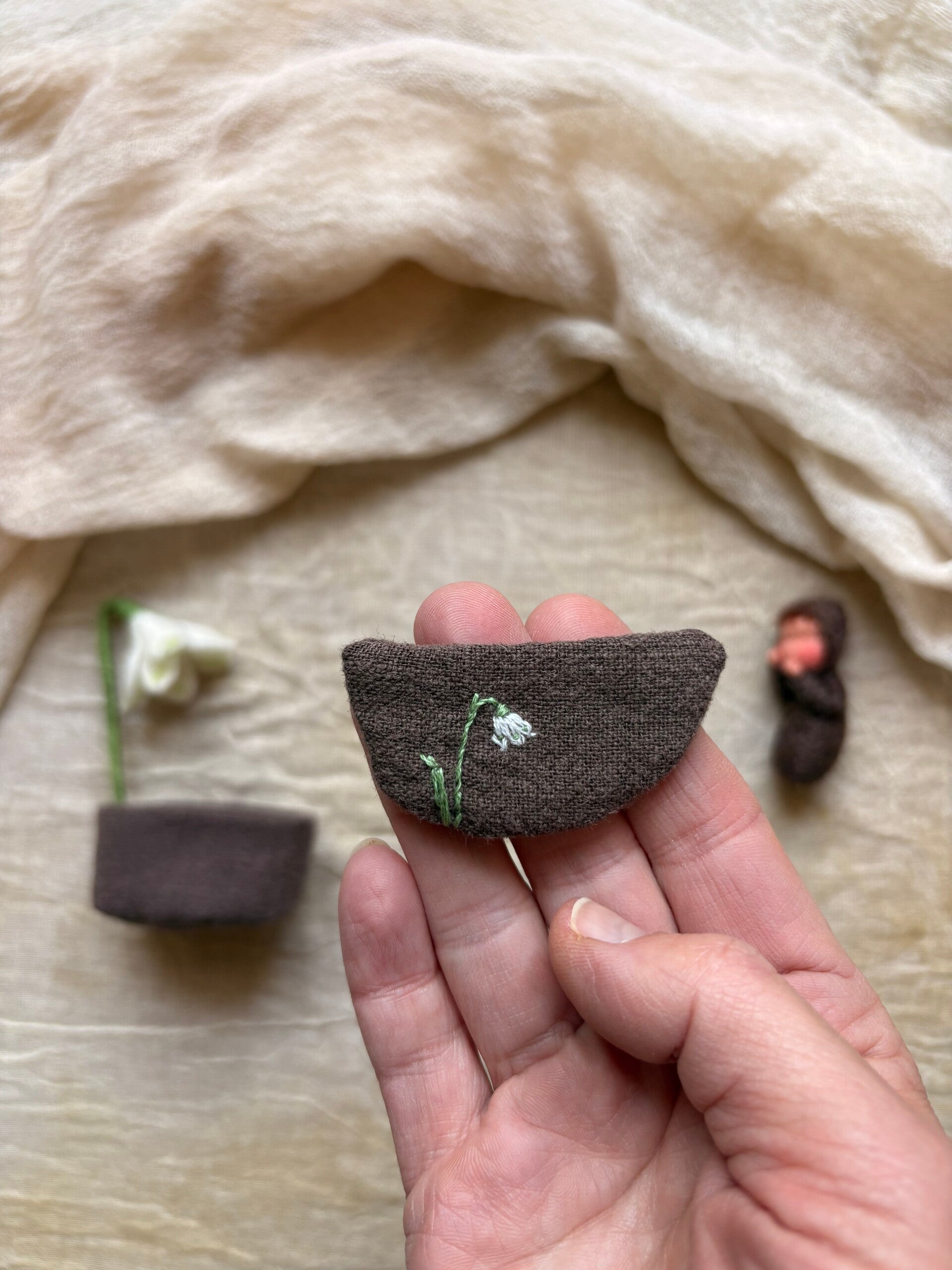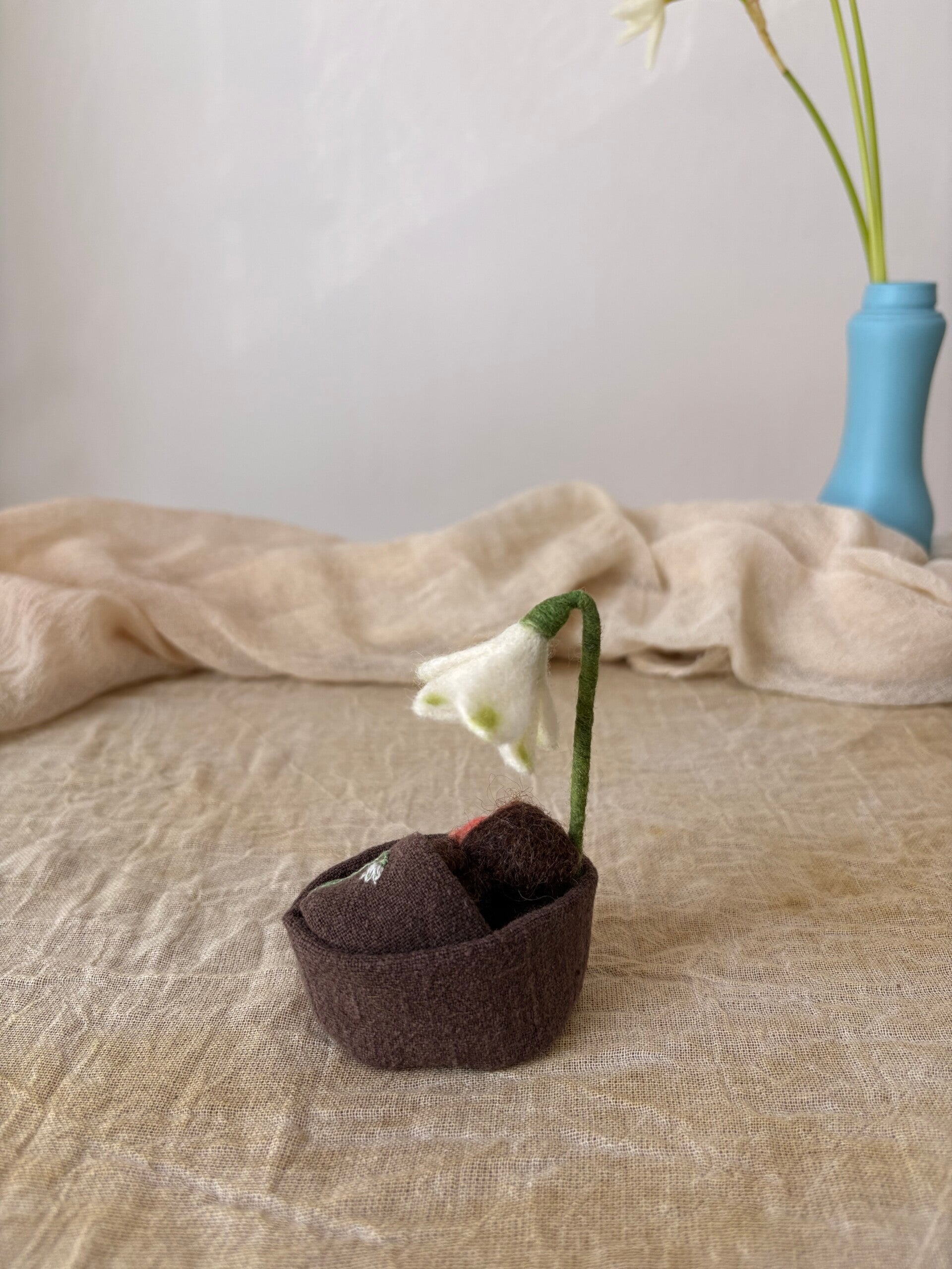 Dit setje heeft een bedje met matrasje, dekentje en een hemelstok met lenteklokje eraan. Met dit setje kun je met het seizoen mee bewegen, van een helemaal neutraal wortelkindje in een aardebedje onder een dekentje, die aan de ene kant effen is en aan de andere kant een geborduurd lenteklokje heeft, tot een wiegje met alle lente tekenen zichtbaar.