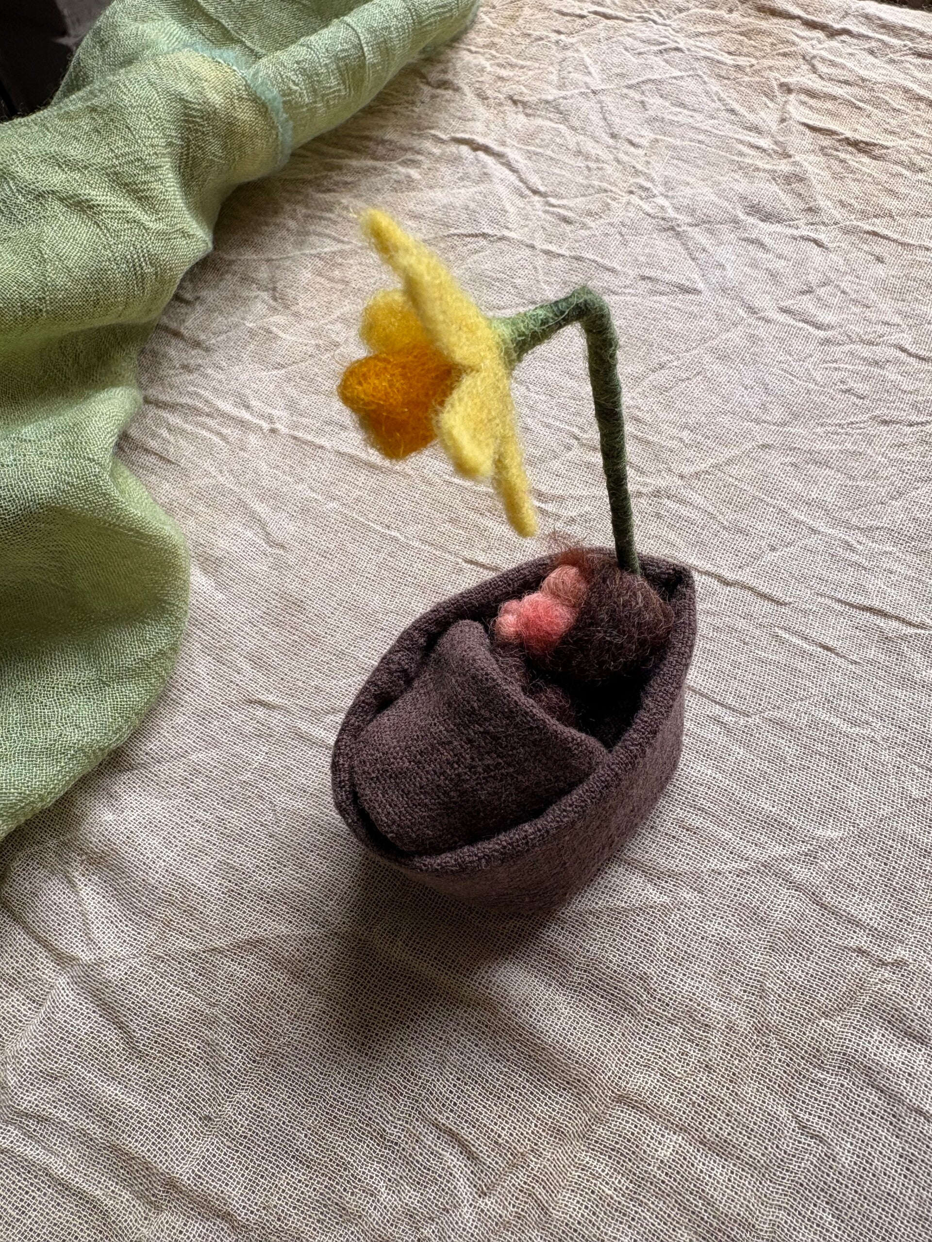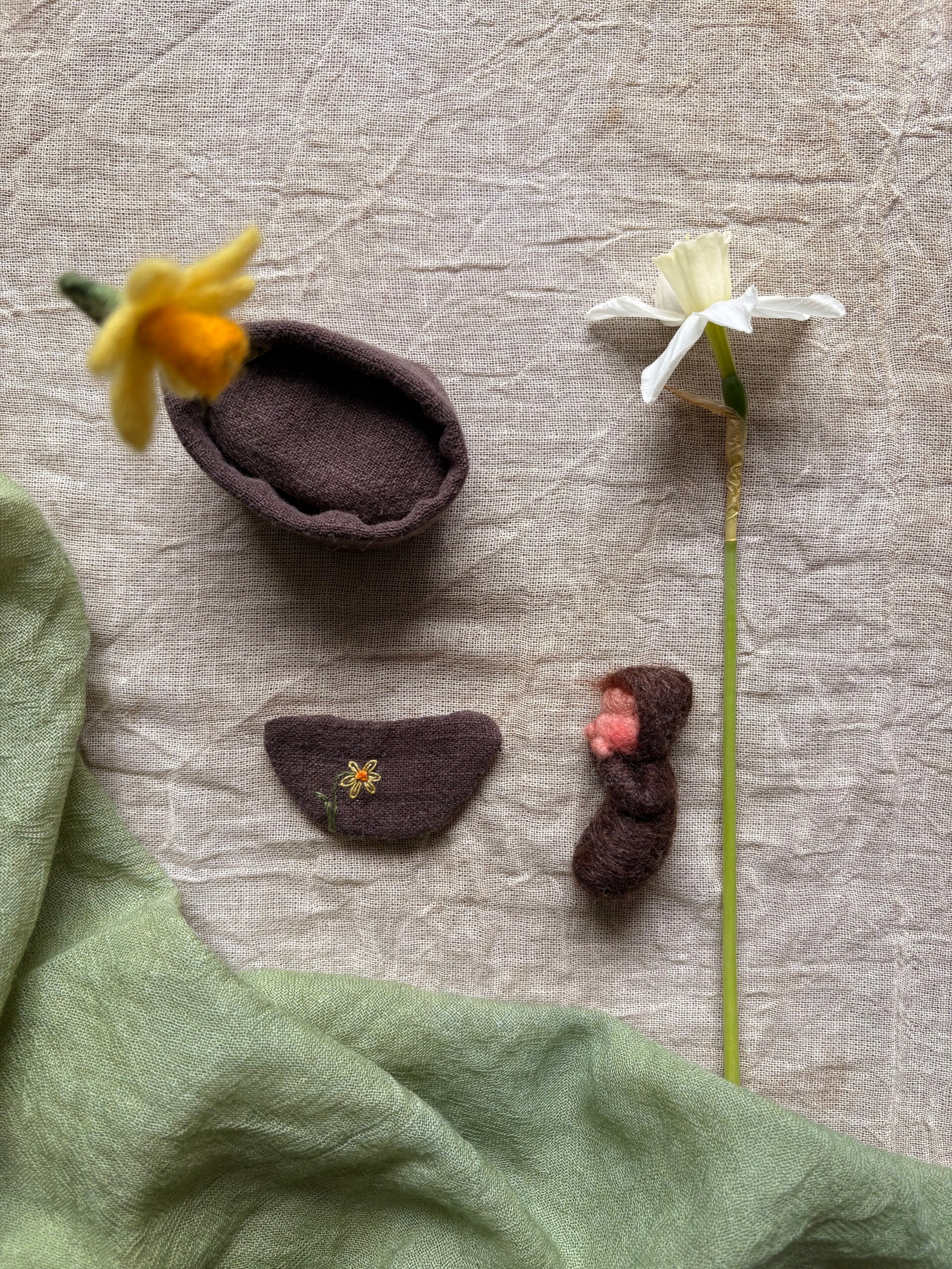 Dit setje kan van helemaal neutraal omgetoverd worden naar een wiegje met een narcis als hemelstok. Zo kan het een wortelkindje zijn en zo kan het aardebedje een wiegje van een narcis kindje zijn. Het dekentje is aan één zijde geborduurd.